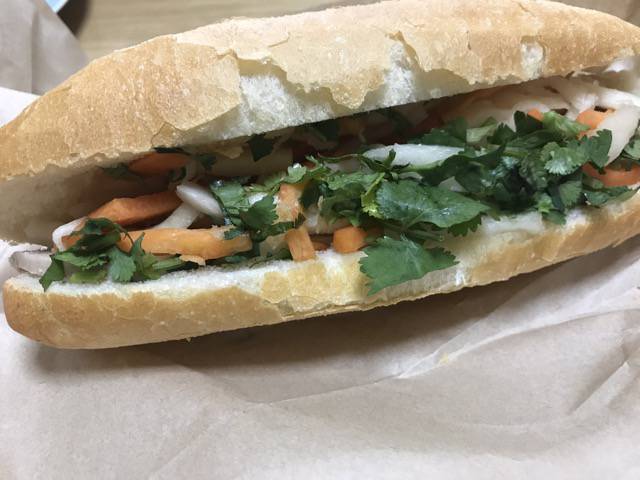 独特のサクッとした柔らかめのベトナム風フランスパンに、パテや酸味のあるナマス、パクチーなどの香草、レバーペーストなどを挟んで食べるのが一般的。